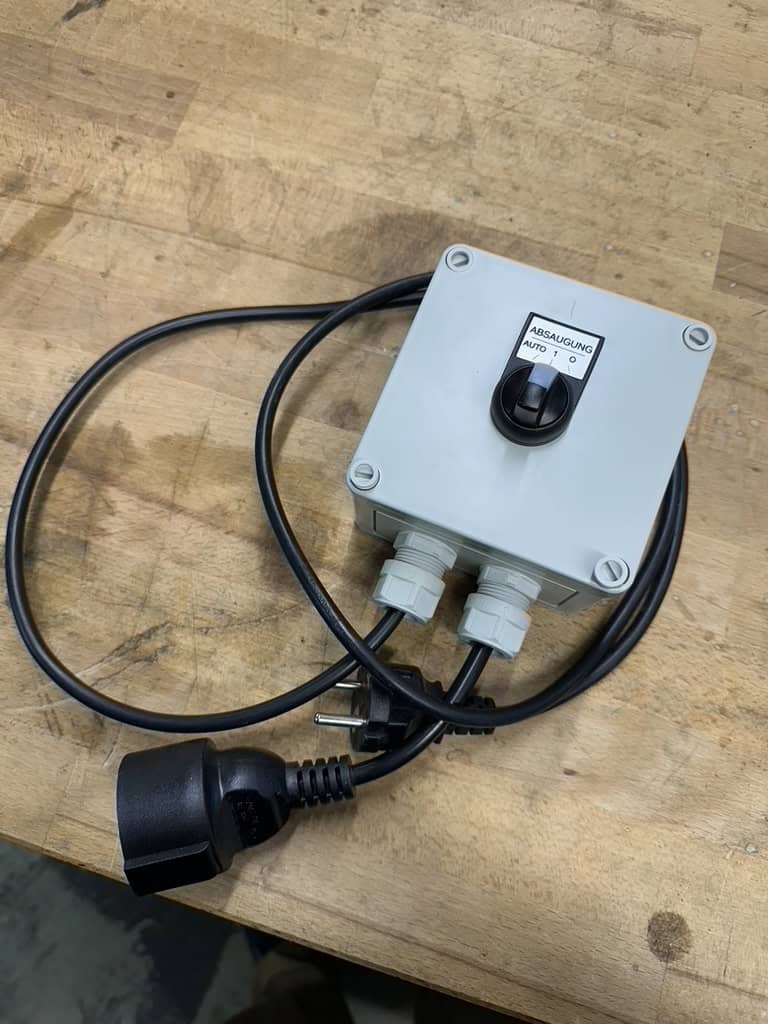 Damit das ganze nicht in die Maschinen selbst eingebaut werden muss habe ich eine kleine Anschlussbox angefertigt, hier in der 230V Version für die Kappsäge. Über den Schalter lässt sich die Absaugung für die Maschine bei Bedarf auch auf Dauer-EIN oder komplett Aus schalten.
